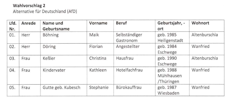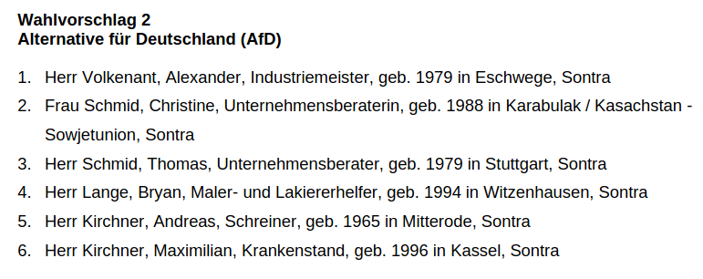 Die Liste für den Kreistag setzt sich aus einigen altbekannten Gesichtern zusammen, die Ende 2024 maßgeblich für die Reaktivierung des Kreisverbands verantwortlich waren. Neben dem 1. Vorsitzenden Berthold Hartmann sind hier Antje Rudolph aus Weißenborn, Petra und Peter Pfotenhauer (Busfahrer beim NVV) aus Witzenhausen, Rolf-Kurt Schlieck, der das Facebookprofil der AfD WMK aus seinem Wohnzimmer in Eschwege/Albungen pflegt, und Heidemarie Fittje aus Hessisch Lichtenau zu nennen. Mit dem Unternehmerpaar Schmid sind neue Mitglieder aus dem vermeintlich bürgerlichen Lager dazugestoßen ebenso wie einige junge Wilde um Lukas Gesang und Bryan Lange. Auch Böhning der in Wanfried kandidiert und schon lange Verbindungen in die rechtsextreme Szene pflegt steht für den Kreistag zur Wahl.